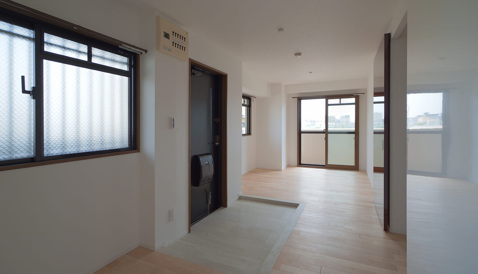 姫路市神子岡前の築28年のマンションの玄関脇の壁を取り払い、暗く狭い玄関を明るく広々としたホールへとリフォーム